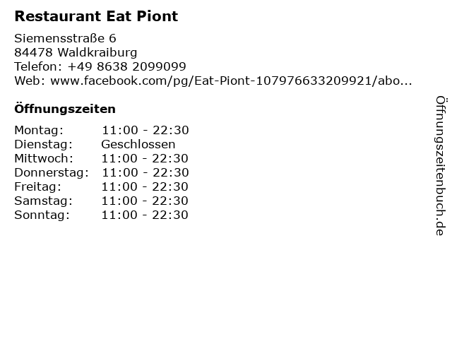 | Öffnungszeiten Restaurant Eat Piont in Waldkraiburg anzeigen | |