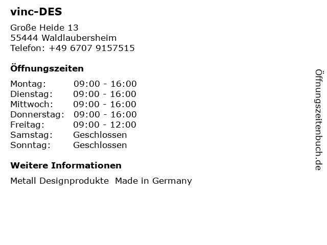 | Öffnungszeiten vinc-DES in Waldlaubersheim anzeigen | |