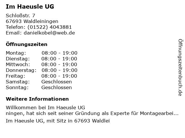 | Öffnungszeiten Im Haeusle UG in Waldleiningen anzeigen | |