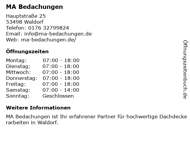 Öffnungszeiten MA Bedachungen in Waldorf anzeigen | |