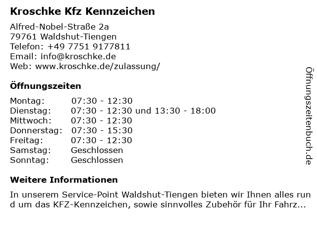 2 ASR Autoschilder GmbH Autoschilderservice (Entfernung: 0,07 km) Alfred-Nobel-Straße 1, 79761 Waldshut-Tiengen 5 Kroschke Kfz Zulassungen und Kennzeichen (Entfernung: 34,33 km) Karl-Fürstenberg-Straße 17, 79618 Rheinfelden (Baden) 6 |