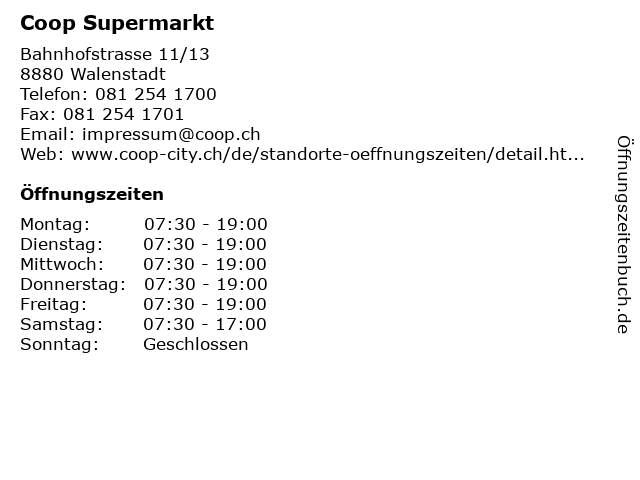 | Öffnungszeiten Coop Supermarkt in Walenstadt anzeigen | |