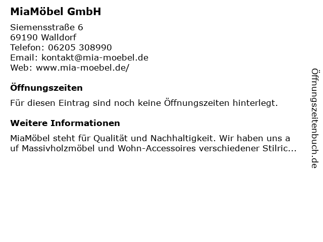| Öffnungszeiten MiaMöbel GmbH in Walldorf anzeigen | |