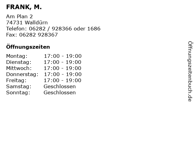 | Öffnungszeiten FRANK, M. in Walldürn anzeigen | |