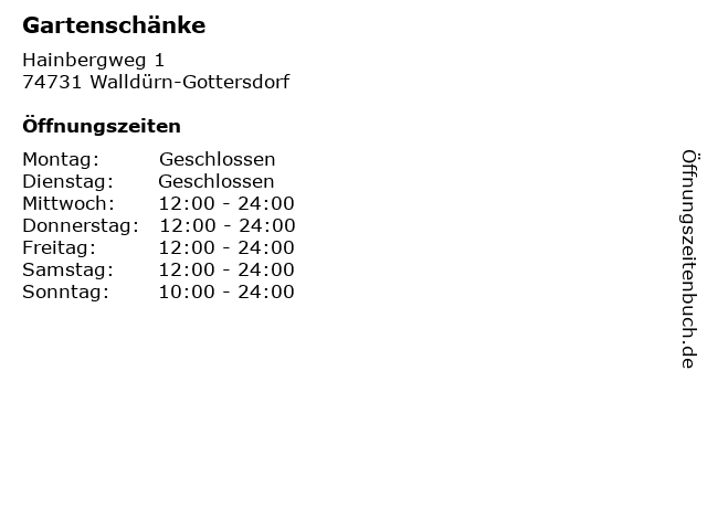 | Öffnungszeiten Gartenschänke in Walldürn-Gottersdorf anzeigen | |