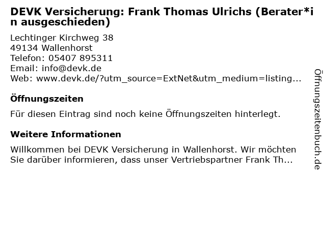 | DEVK Versicherung: Frank Thomas Ulrichs (Berater*in ausgeschieden) anrufen | |