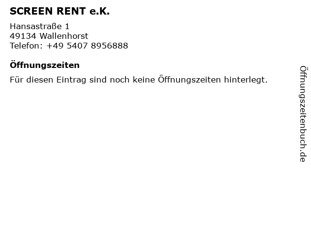 | Öffnungszeiten SCREEN RENT e.K. in Wallenhorst anzeigen | |