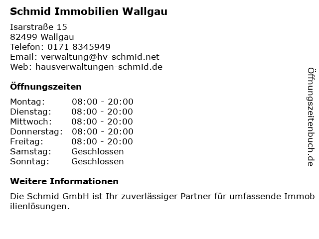 | Öffnungszeiten Schmid Immobilien Wallgau in Wallgau anzeigen | |