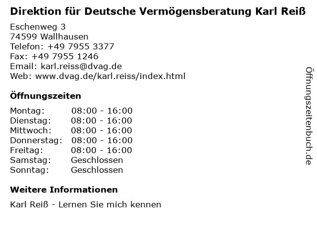 4 Gerhard Reiß Stuckateurbetrieb (Entfernung: 5,18 km) In den Dorfwiesen 19, 74592 Kirchberg an der Jagst 6 Deutsche Vermögensberatung (Dvag), Seydan Eslikizi (Entfernung: 8,19 km) Postplatz 7, 74564 Crailsheim |