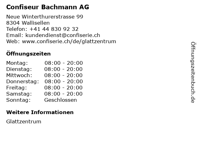 | Öffnungszeiten Confiseur Bachmann AG in Wallisellen anzeigen | |