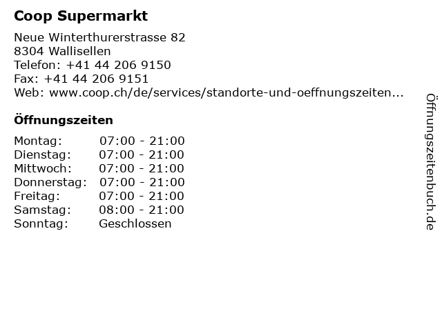 | Öffnungszeiten Coop Supermarkt in Wallisellen anzeigen | |