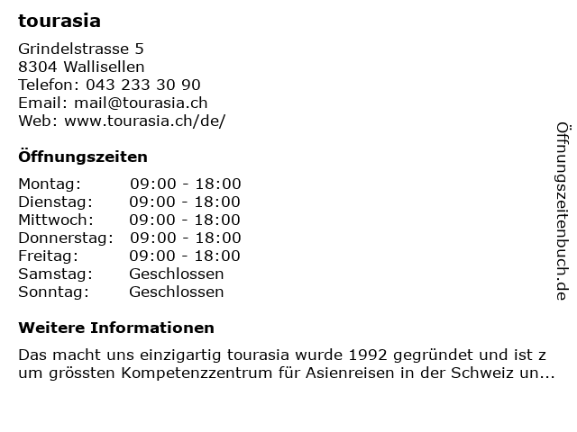 | Öffnungszeiten tourasia in Wallisellen anzeigen | |
