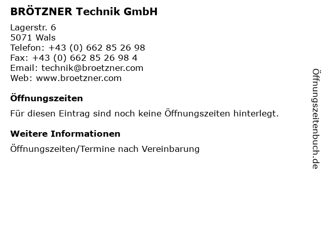 | Öffnungszeiten BRÖTZNER Technik GmbH in Wals anzeigen | |
