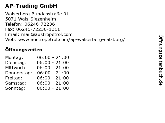 | Öffnungszeiten AP-Trading GmbH in Wals-Siezenheim anzeigen | |