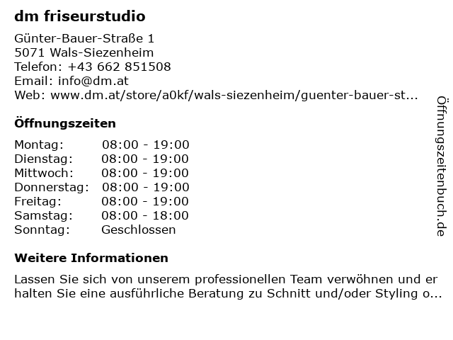 | Öffnungszeiten dm friseurstudio in Wals-Siezenheim anzeigen | |