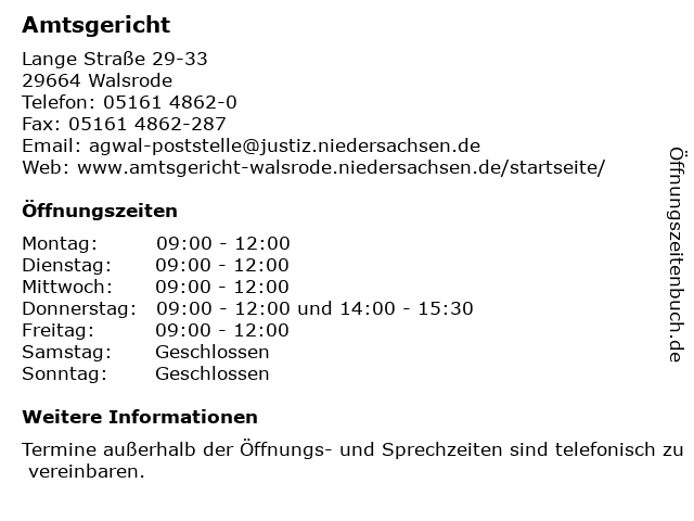 | Öffnungszeiten Amtsgericht in Walsrode anzeigen | |