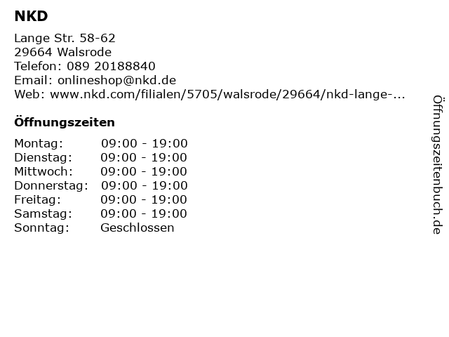 | Öffnungszeiten NKD in Walsrode anzeigen | |