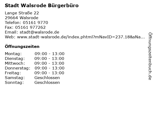 | Öffnungszeiten Stadt Walsrode Bürgerbüro in Walsrode anzeigen | |