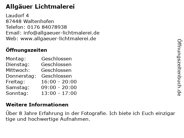 | Öffnungszeiten Allgäuer Lichtmalerei in Waltenhofen anzeigen | |