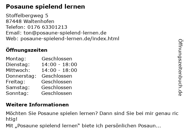 | Öffnungszeiten Posaune spielend lernen in Waltenhofen anzeigen | |