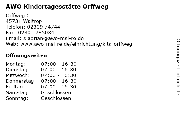 | Öffnungszeiten AWO Kindertagesstätte Orffweg in Waltrop anzeigen | |