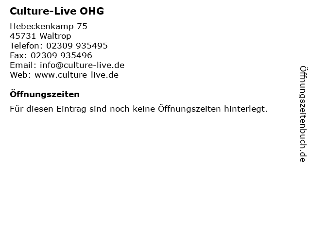 | Öffnungszeiten Culture-Live OHG in Waltrop anzeigen | |