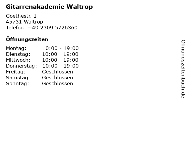 | Öffnungszeiten Gitarrenakademie Waltrop in Waltrop anzeigen | |