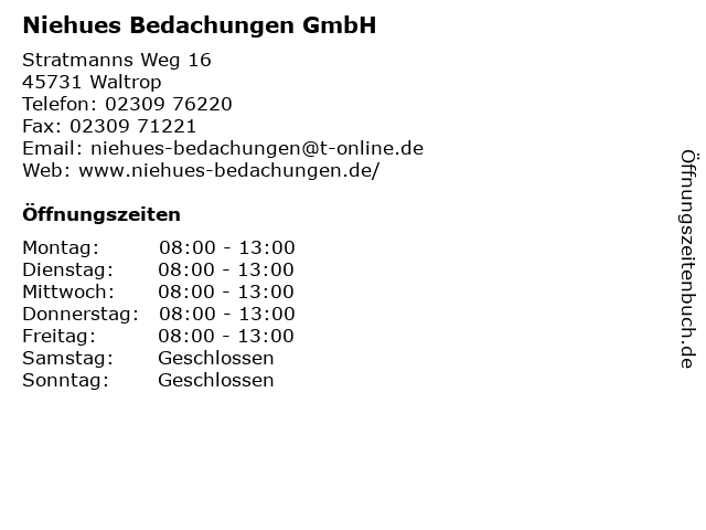 | Öffnungszeiten Niehues Bedachungen GmbH in Waltrop anzeigen | |