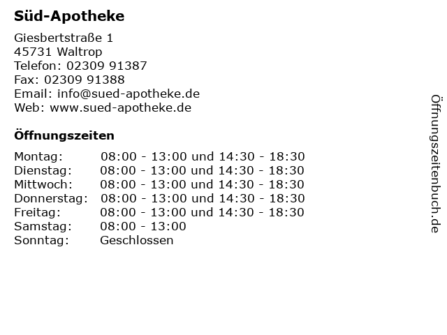 | Öffnungszeiten Süd-Apotheke in Waltrop anzeigen | |