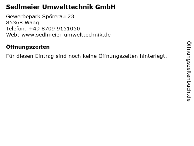 | Öffnungszeiten Sedlmeier Umwelttechnik GmbH in Wang anzeigen | |