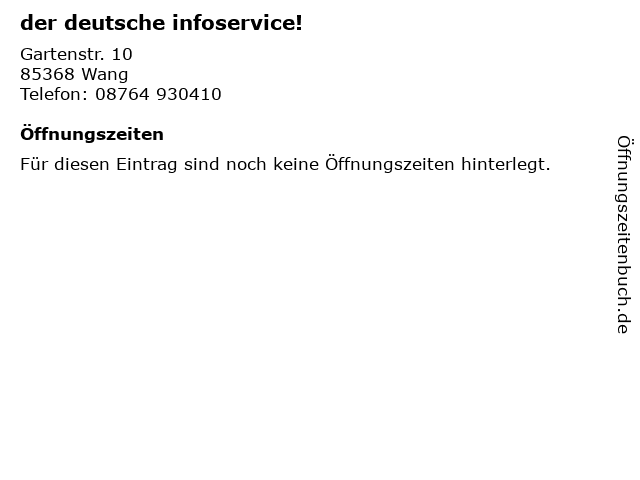 | Öffnungszeiten der deutsche infoservice! in Wang anzeigen | |