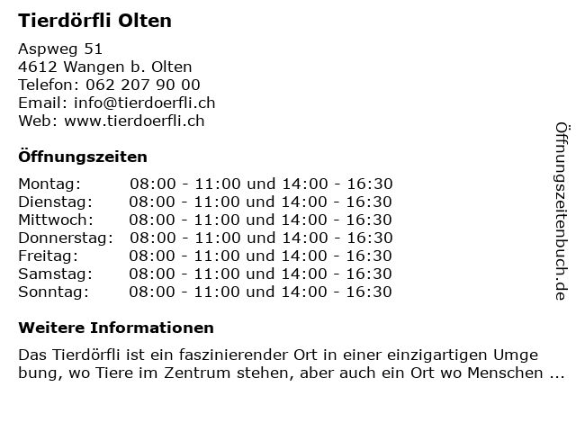 | Öffnungszeiten Tierdörfli Olten in Wangen b. Olten anzeigen | |