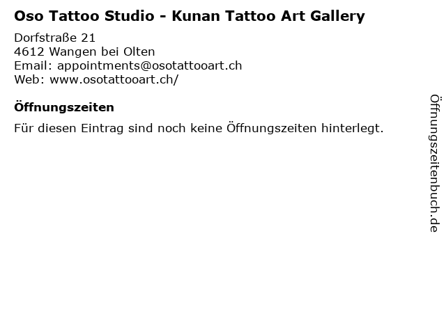 | Öffnungszeiten Oso Tattoo Studio - Kunan Tattoo Art Gallery in Wangen bei Olten anzeigen | |