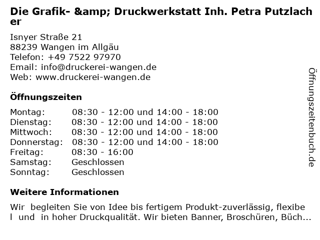 2 Schnittstelle 03 / Ihr Partner für Werbung und Grafik Design in Wangen im Allgäu. (Entfernung: 0,54 km) Wolfgangweiher 3, 88239 Wangen 5 Heinle Petra, Allgäu-Immo-Service Immobilien (Entfernung: 11,88 km) Am Steinacker 19, 88167 Röthenbach 6 |