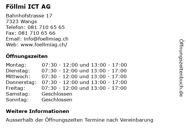 | Öffnungszeiten Föllmi ICT AG in Wangs anzeigen | |