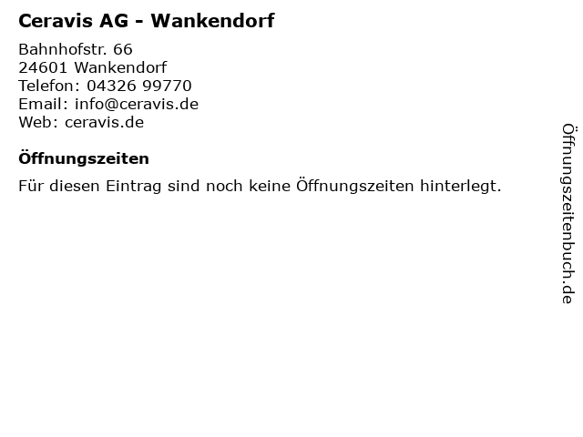 | Öffnungszeiten Ceravis AG - Wankendorf in Wankendorf anzeigen | |