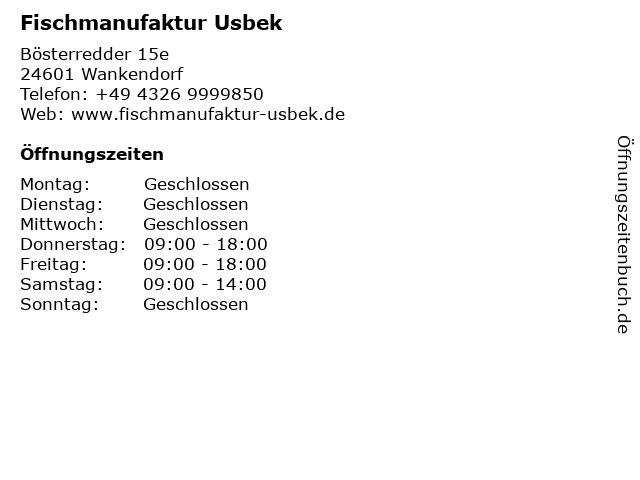 | Öffnungszeiten Fischmanufaktur Usbek in Wankendorf anzeigen | |