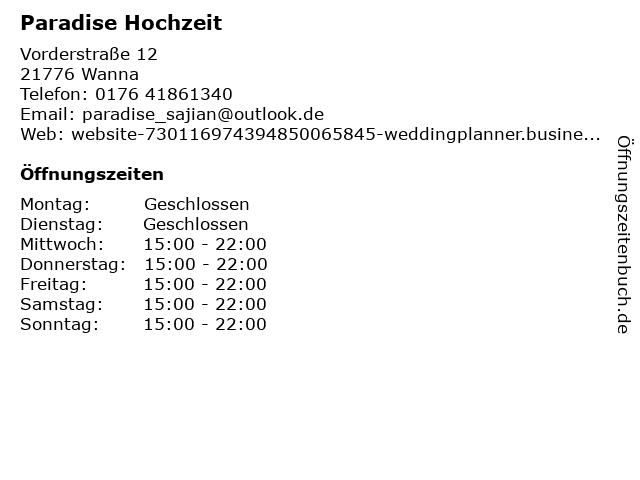 | Öffnungszeiten Paradise Hochzeit in Wanna anzeigen | |