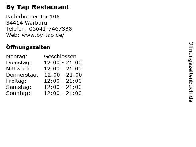 | Öffnungszeiten By Tap Restaurant in Warburg anzeigen | |