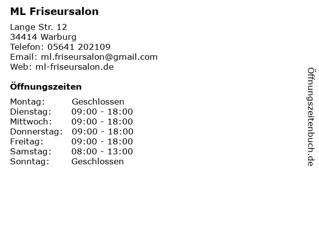 | Öffnungszeiten ML Friseursalon in Warburg anzeigen | |
