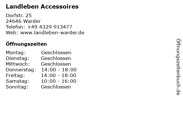 | Öffnungszeiten Landleben Accessoires in Warder anzeigen | |