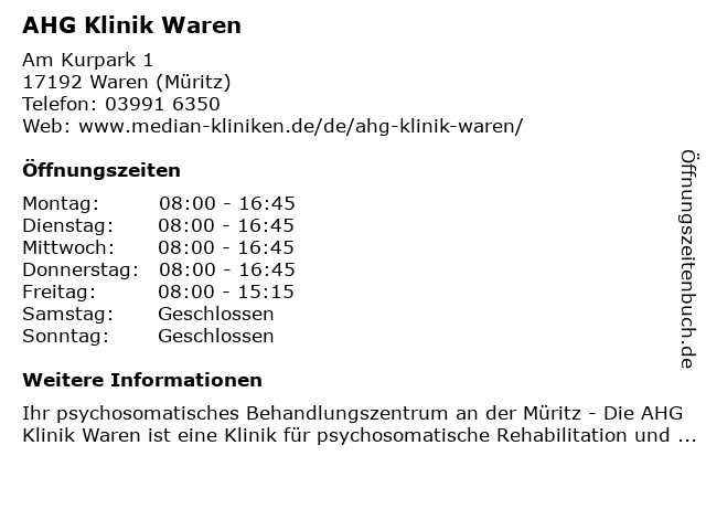 | Öffnungszeiten AHG Klinik Waren in Waren (Müritz) anzeigen | |
