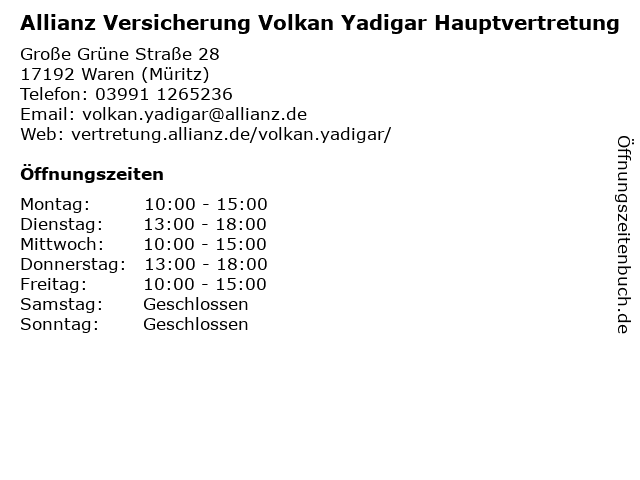 1 Allianz Versicherung Thilo Jung Hauptvertretung (Entfernung: 0,02 km) Große Grüne Straße 1, 17192 Waren (Müritz) 2 Allianz Versicherung Yvonne Fischer Hauptvertretung (Entfernung: 0,25 km) Mühlenstraße 16, 17192 Waren (Müritz) 3 DEVK Versicherungen: Volkan Yadigar (Berater*in ausgeschieden) (Entfernung: 0,73 km) Bahnhofstr. 10, 17192 Waren 4 Allianz Versicherung Maria Barner Hauptvertretung (Entfernung: 16,04 km) Kirchplatz 19, 17207 Röbel/Müritz 5 Allianz Versicherung Michael Appel Hauptvertretung (Entfernung: 16,13 km) Marktplatz 5, 17207 Röbel/Müritz 6 Allianz Versicherung Annett Jenning Hauptvertretung (Entfernung: 17,75 km) Bahnhofstraße 1, 17213 Malchow |