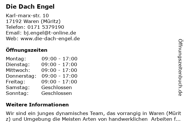 | Öffnungszeiten Die Dach Engel in Waren (Müritz) anzeigen | |