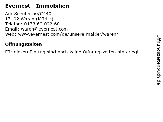 | Öffnungszeiten Evernest - Immobilien in Waren (Müritz) anzeigen | |
