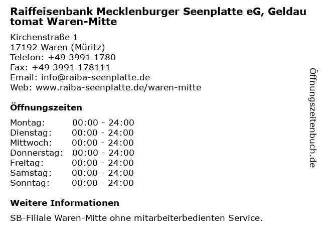 Branchen & Suchbegriffe zu Raiffeisenbank Mecklenburger Seenplatte eG, Geldautomat Waren-Mitte:eg, geldautomat, kontoauszugsdrucker, mecklenburger, mitte, raiffeisenbank, seenplatte, waren |
