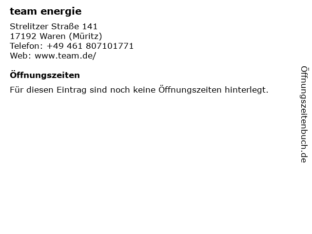 | Öffnungszeiten team energie in Waren (Müritz) anzeigen | |