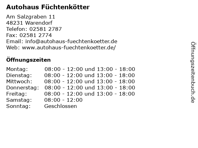 | Öffnungszeiten Autohaus Füchtenkötter in Warendorf anzeigen | |