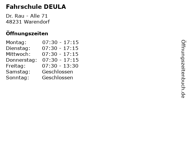 | Öffnungszeiten Fahrschule DEULA in Warendorf anzeigen | |