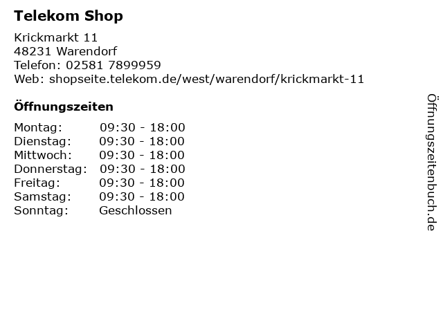 | Öffnungszeiten Telekom Shop in Warendorf anzeigen | |